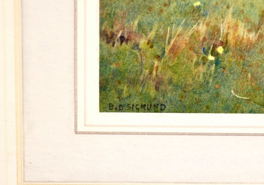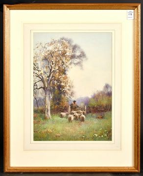 Benjamin Sigmund (1857-1947) British, A Shepherd and his flock beneath blossom, watercolour, signed, 14" x 10".