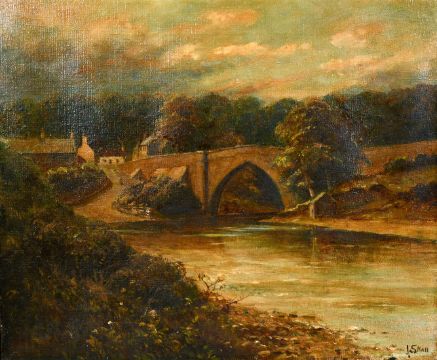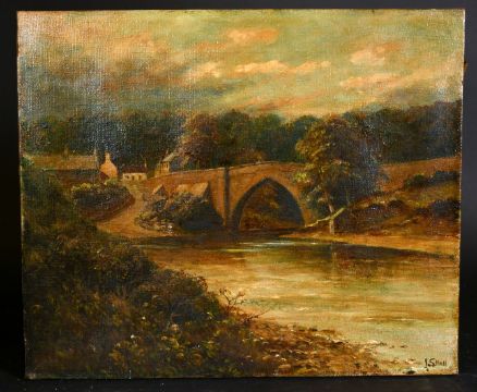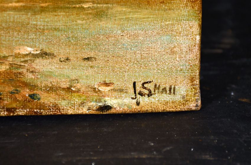 J. S. Hall early 20th century, A river landscape with a river and cottages beyond, oil on canvas, signed, 13" x 15.25".