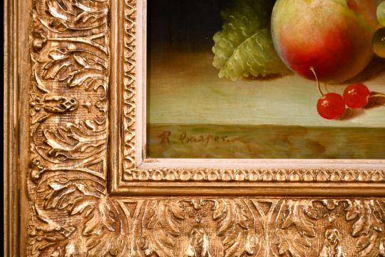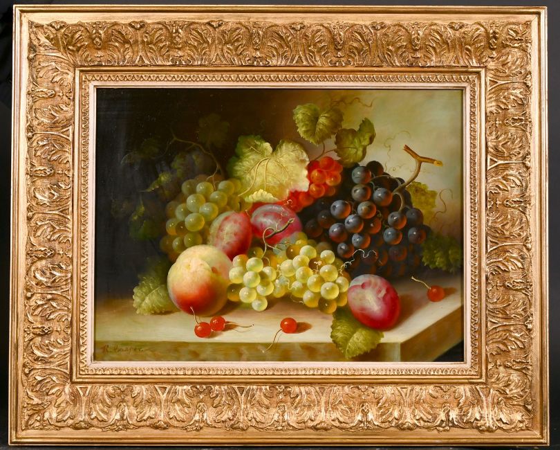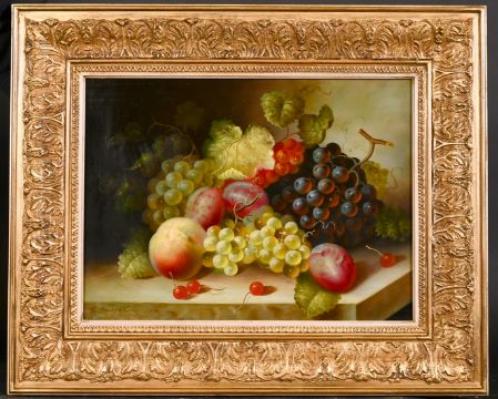 R. Casper (20th century) A still life of fruit and vines on a marble shelf, signed, oil on panel, 12" x 16".