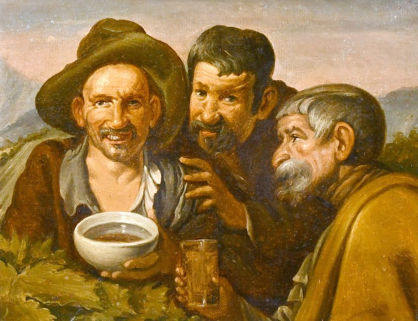After Velazquez 'Los Borrachos', a scene of three happy gentleman, Circa 1900, oil on canvas, 8.5" x 10.5".