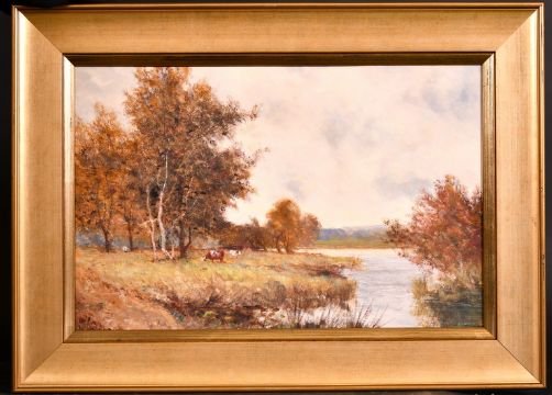 W. Martin, A pair of oil on board scenes of sheep and cattle grazing by a river, signed, each 12" x 18".