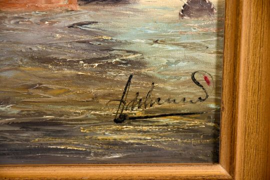 20th century continental school, shipping in a busy port, oil on canvas, indistinctly signed, 19.75" x 27.5".