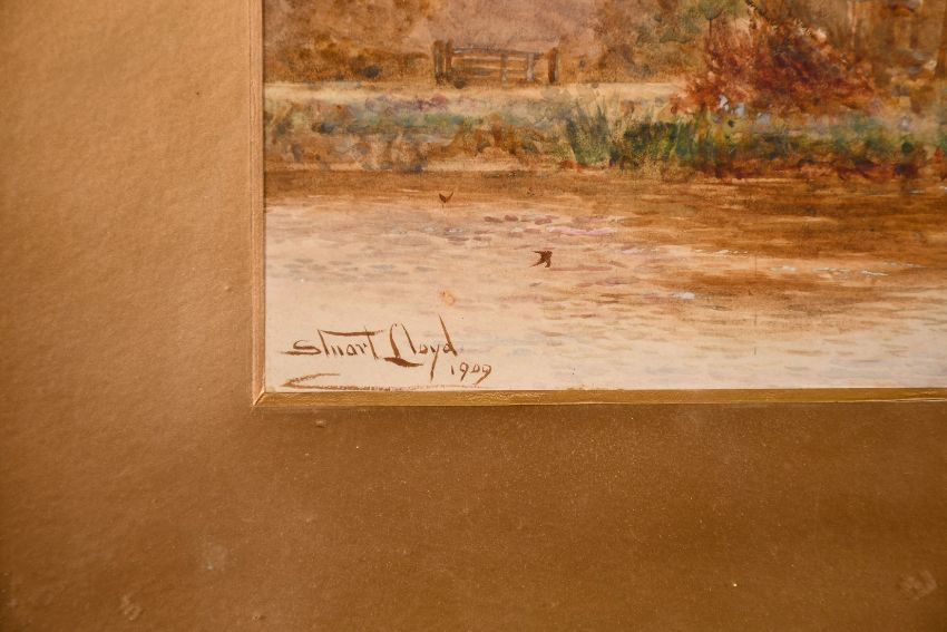 Walter Stuart Lloyd (1875-1929) British, figures fishing in a river with a barn beyond, watercolour, signed and dated '1909', 9" x 13.5".