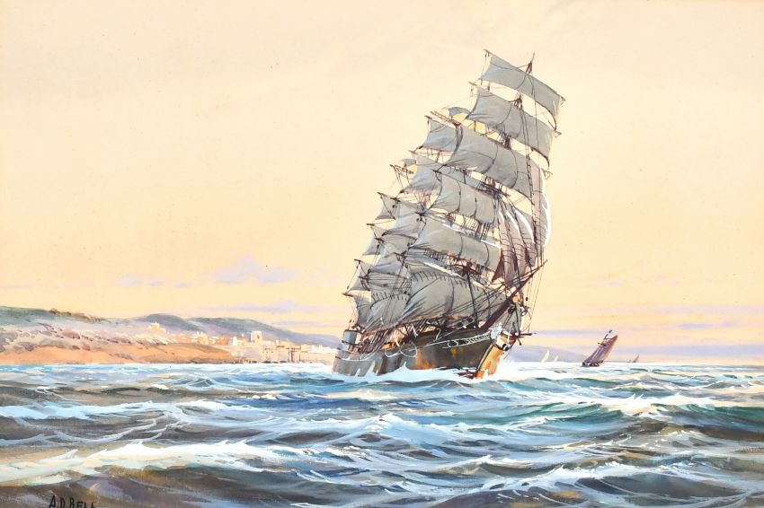 A. D. Bell (20th century) British, 'Evening in the Channel', a clipper at full sail off a headland, watercolour, signed, 10" x 14".