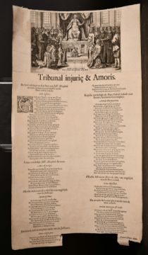Crispin Van de Passe II, 17th century old master engraving, 'Tribunal Injurie and Amoris', Elizabeth Stevenon and Gabriel Lalande, incorporated into a broadside with some loss at the lower edge, 20" x 11.5", (unframed).