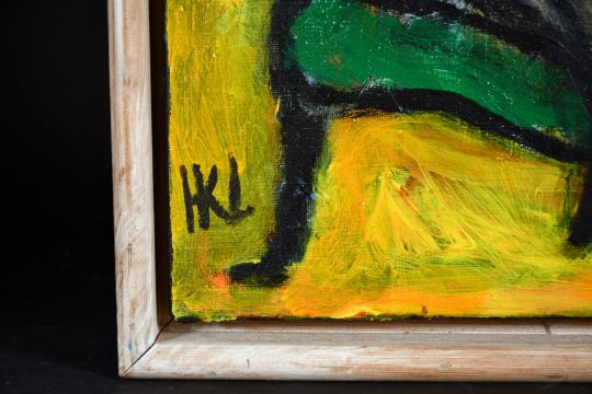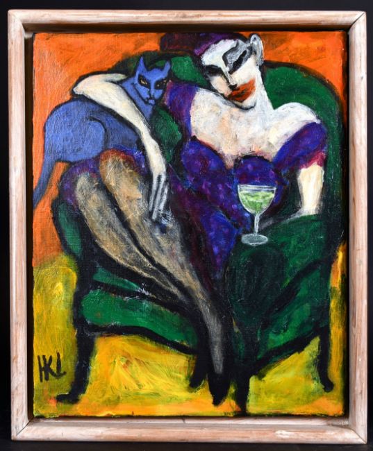 Larsen, 20th century Danish school, 'Absinth Time', A female figure and her cat, oil on canvas, signed, 16" x 13".