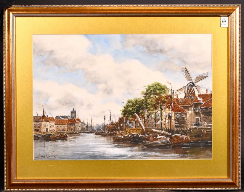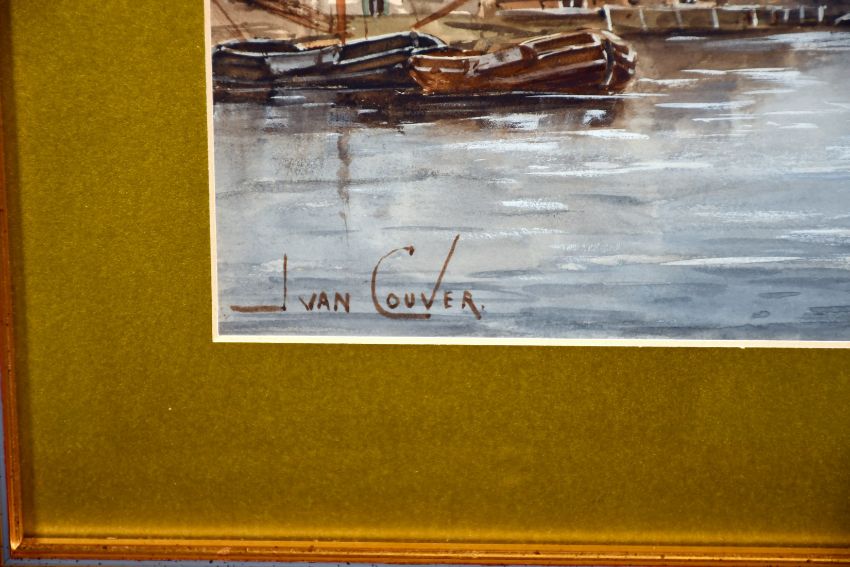 Jan Van Couver (1864-1910) Dutch, A Dutch Port scene with moored boats and buildings, watercolour, signed, 14.25" x 20.75".