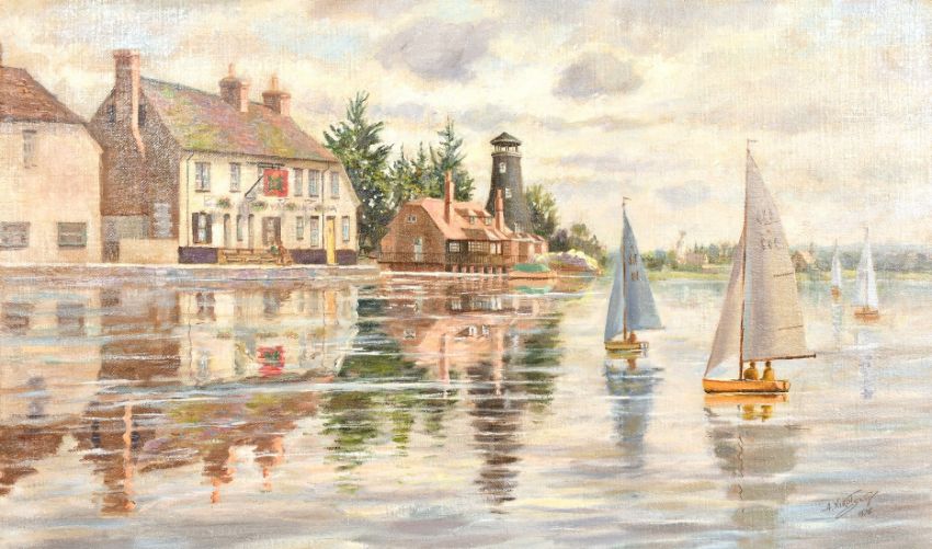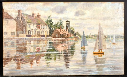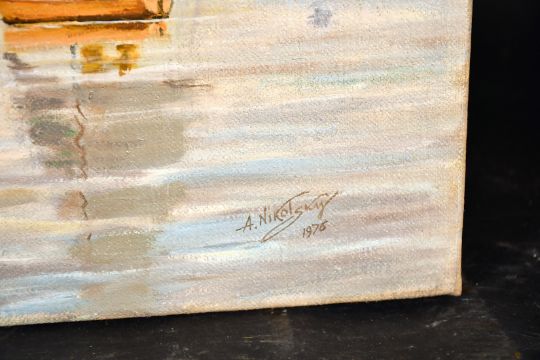 Athanasius Nikolsky. (act. 1950-1980) 'The Royal Oak, Langton at High Tide', oil on canvas, signed and dated '1975', 18" x 30", (unframed).
