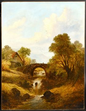 J. Andrews (19th century school) British, an angler on a mountain stream with a watermill and bridge beyond, oil on canvas, signed, 36" x 28", (unframed).