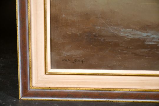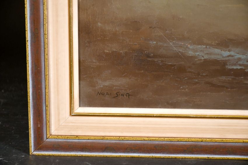 Ngai Sing (Mid-20th century) Chinese junks in calm waters with mountains beyond, oil on canvas, signed, 18" x 24".