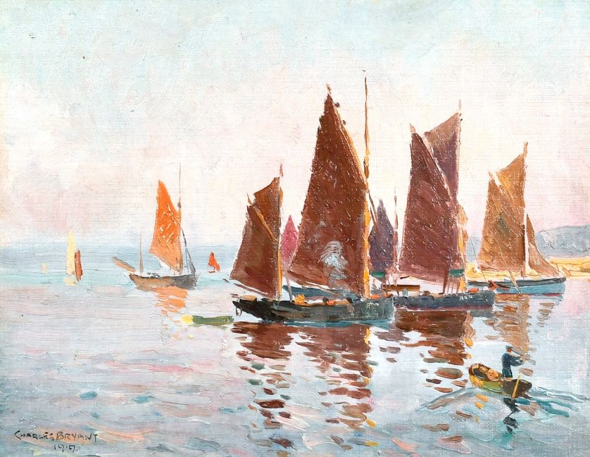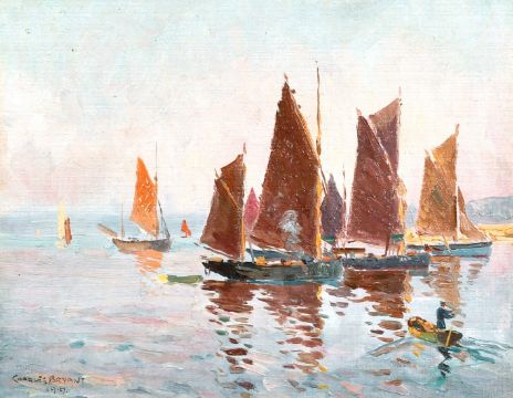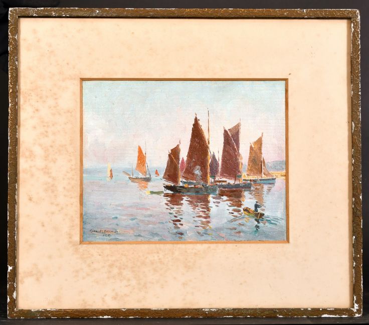 Charles Bryant (1883-1937) Australian, a figure on a boat making his way to sailboats anchored near the coast, oil on canvas, signed inscribed on label verso and dated '1919', 7.5" x 9.5".