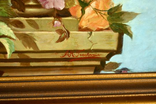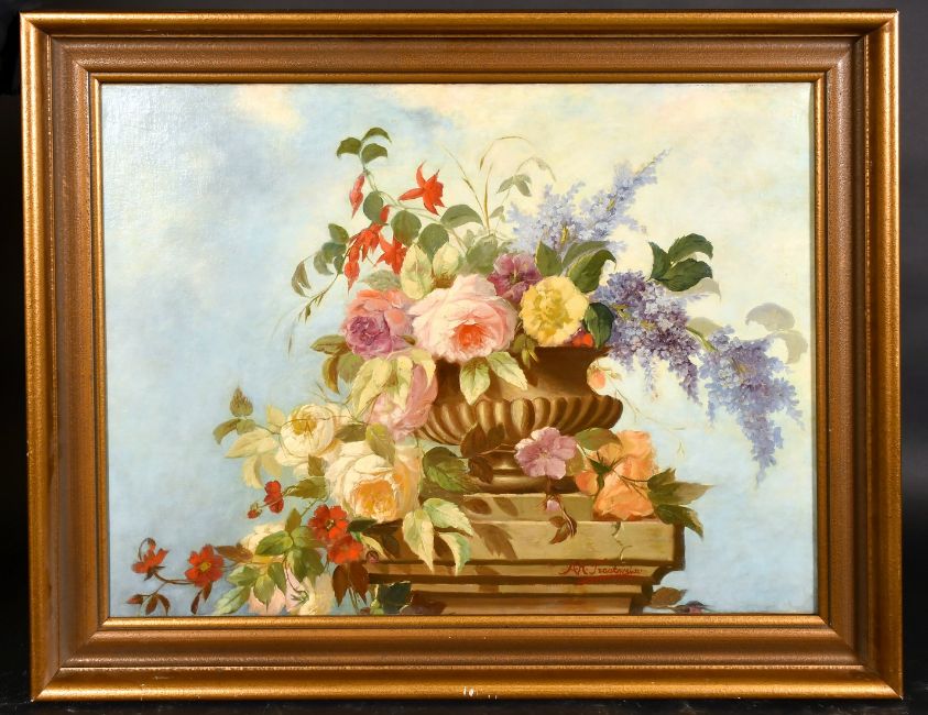 A. H. Trautwein (19th century), A still life composition of mixed flowers in a classical marble urn, oil on canvas, signed, 23.5" x 31.5".