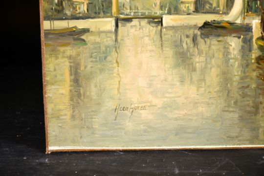 Hendrick Ten Hoven (b. 1901) Dutch, A canal scene with a barge drying sails, oil on canvas, signed, 22" x 33", (unframed).
