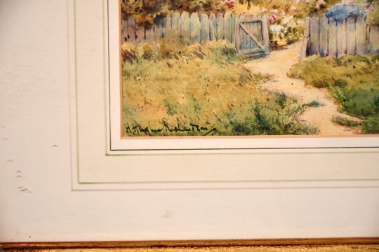 H. Hughes Richardson (1882-1964) British, A country cottage with a garden in bloom with a seated female figure in the foreground, watercolour, signed, 9.25" x 12.5".