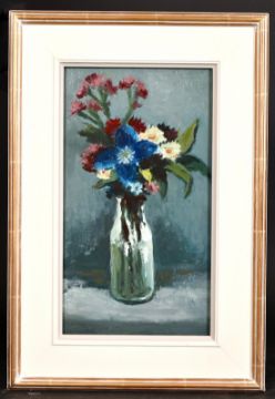 H. E. Lewis, A still life of mixed flowers in a glass vase, oil on board, signed with initials, 9" x 15".