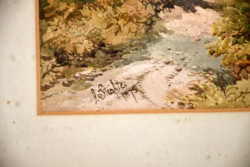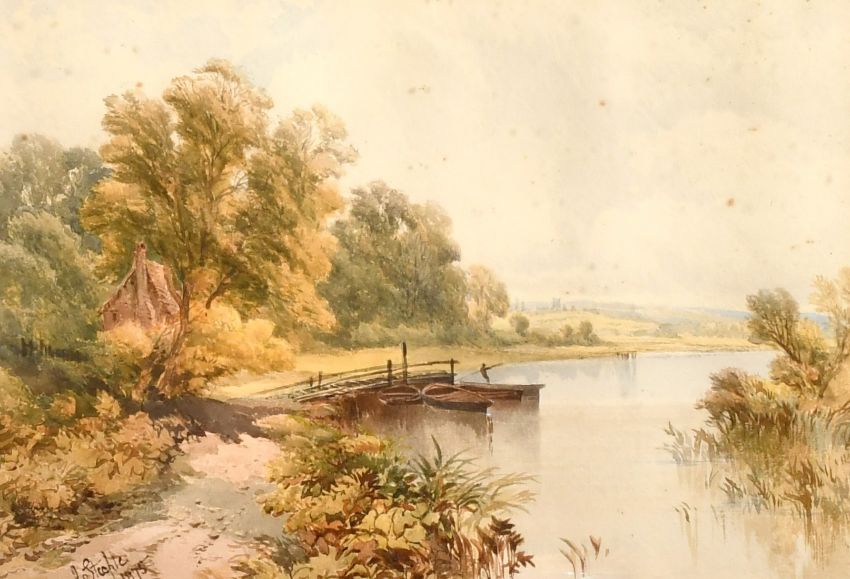 John Steeple (1823-1887) British, Boats moored in a river landscape with a bankside cottage, watercolour, signed and dated '1875' inscribed to mount, 9.5" x 14".