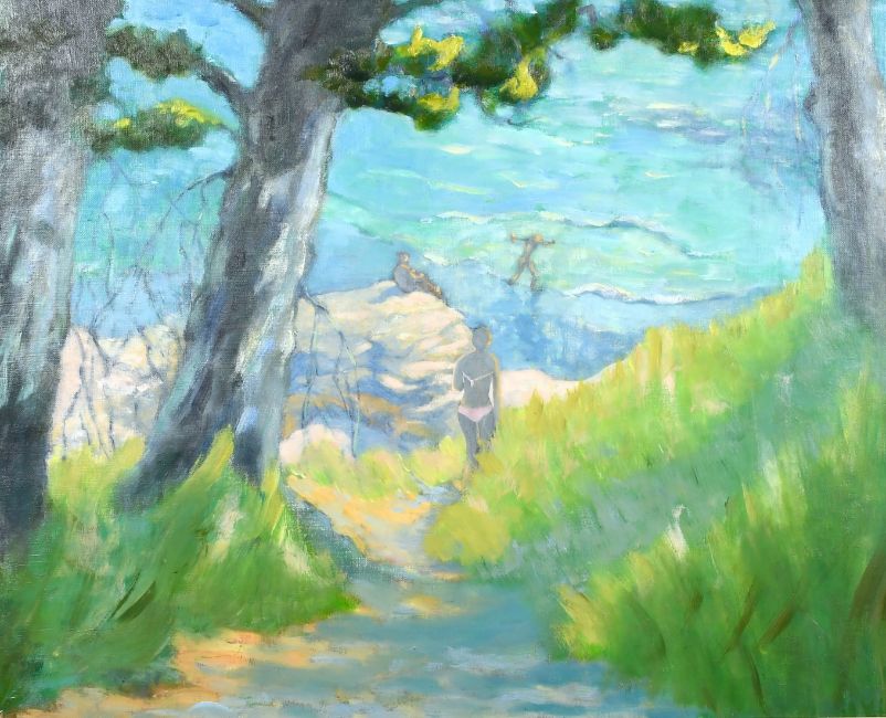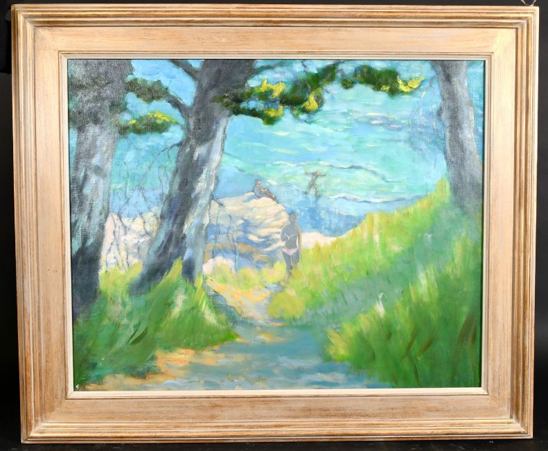 Barbara Haines (20th century) Falmouth, A figure on a pathway between trees, with surfers beyond, oil on canvas, 24" x 30".
