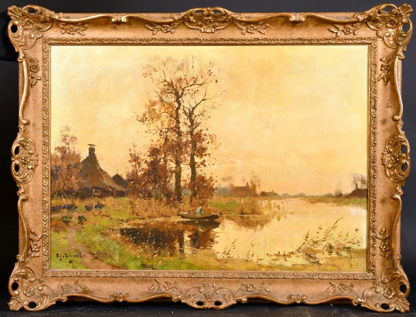 19th/20th century Dutch school, A scene of figure in a boat with trees and cottages, oil on canvas indistinctly signed, 20" x 27".