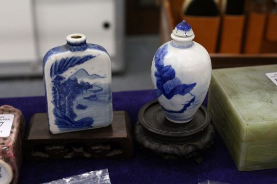 Two Chinese blue and white snuff bottles with associated stands.