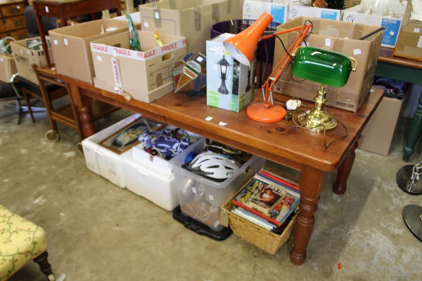 A large stained pine kitchen table.