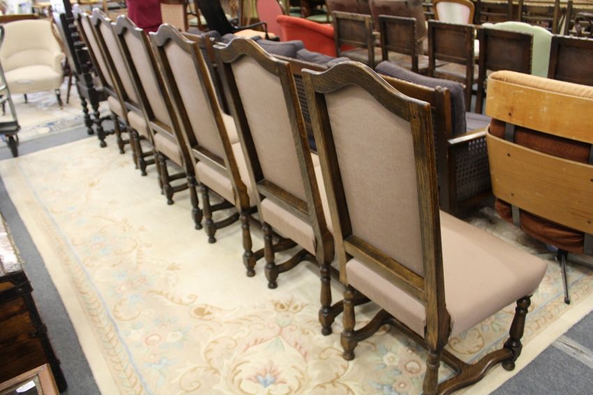A set of six oak framed high back dining chairs.