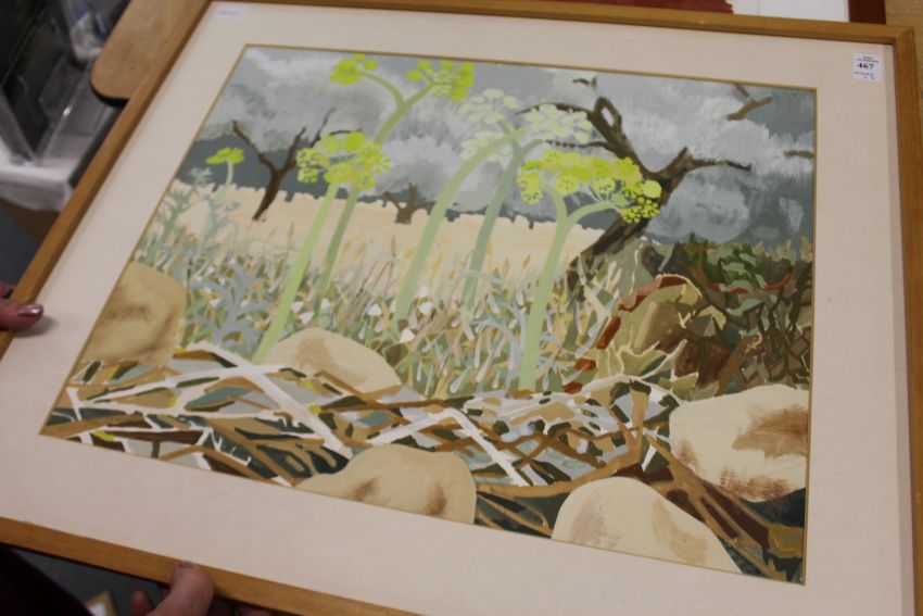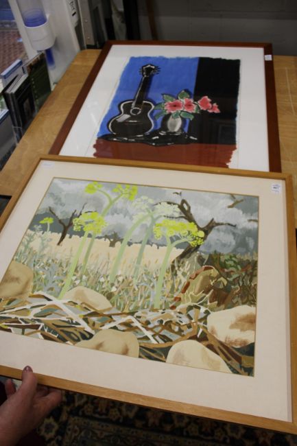 A colourful landscape watercolour together with a still life of a guitar and flowers in a vase.