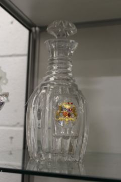 A good cut glass decanter with gilded and enamelled armorial crest.