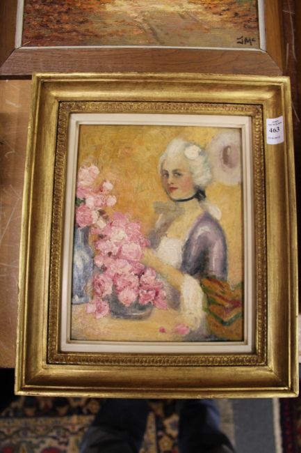 19th century English school, a study of a female arranging flowers, oil on canvas.
