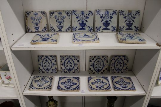 A good collection of sixteen Delft blue and white tiles, probably 18th / 19th century, mostly depicting flowers in urns together with a seated dog.