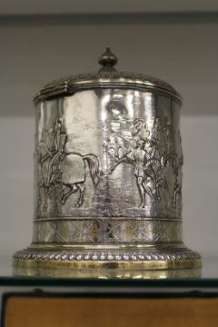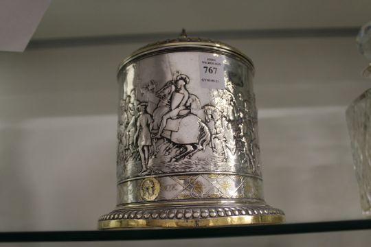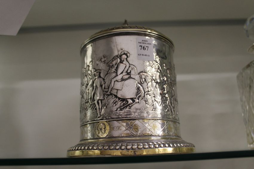 A good plated biscuit barrel decorated with knights on horseback etc.