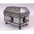 A GOOD 19TH CENTURY SILVER INLAID BIDRI CASKET, with circular bosses to each side, with stylised inlaid silver decoration, 26cm wide, 14cm high, 14cm deep.