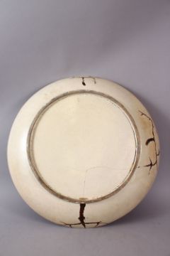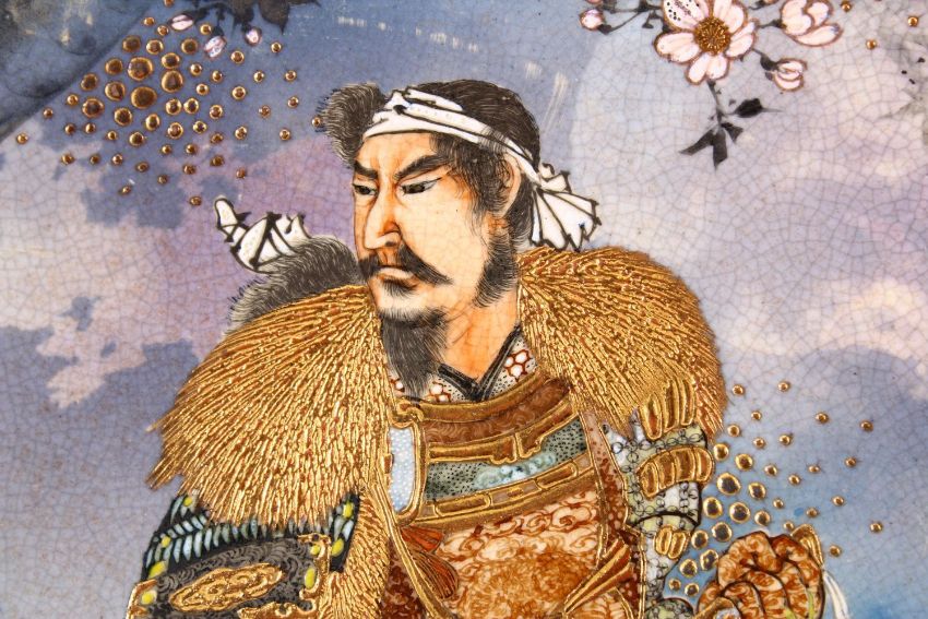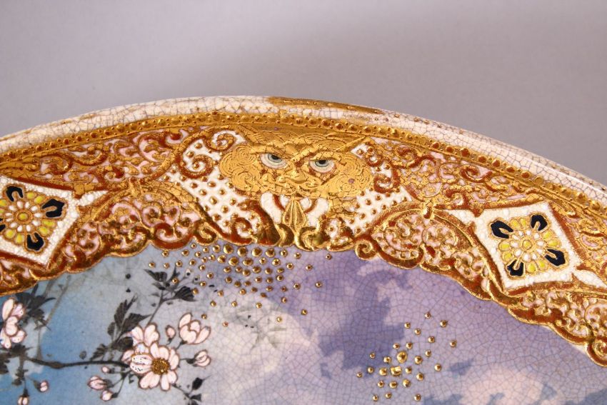 A LARGE JAPANESE MEIJI PERIOD SATSUMA EARTHENWARE CHARGER - SAMURAI & POEM, the large charger depicting a famous story of the samurai writing a poem upon a tree, in a native landscape with gilt raised decoration, 47.5cm (AF)