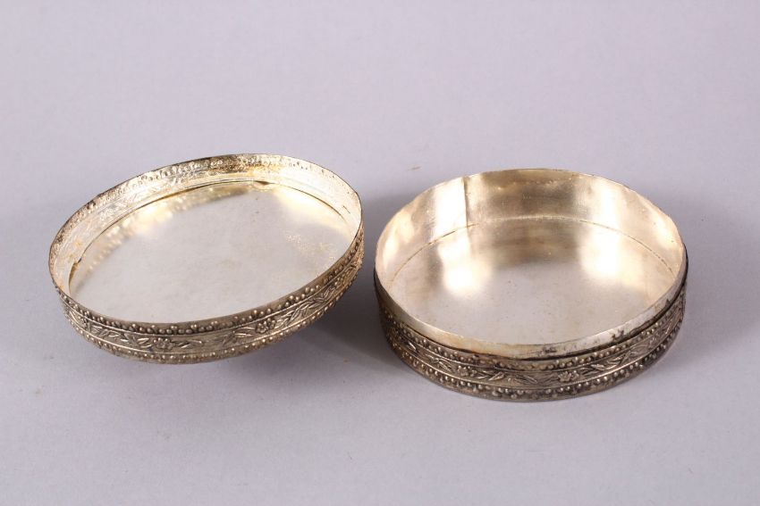 A CHINESE FAMILLE ROSE & WHITE METAL MOUNTED PORCELAIN COVER, the cover decorated with dragons an phoenix birds, with a six character mark, housed in white metal mounts forming a cylindrical box & cover, 9.5cm,