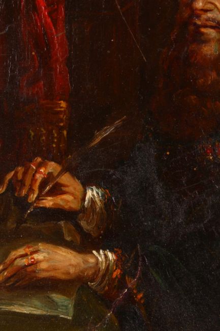 A FINE POSSIBLY ITALIAN SCHOOL OIL PAINTING OF A TURKISH OTTOMAN GENTLEMAN, posed at a desk with a quill, in a gilt moulded frame, 40cm x 36cm.
