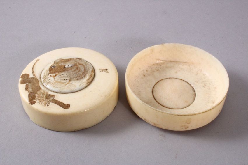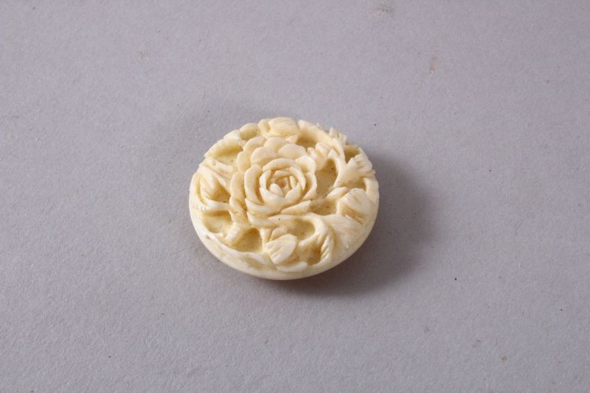 A MIXED LOT OF CHINESE / JAPANESE CARVED IVORY ITEMS, comprising a Japanese meiji cylindrical lidded lion box, 6cm, a canton carved floral belt buckle, 7cm x 5cm, a small carved canton button, 2.8cm, and a canton carved slide top puzzle box, 5.5cm square.