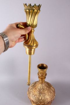 A LARGE TURKISH OTTOMAN GILDED COPPER HUQQA BASE, with raised moulded floral motif decoration, 49cm high.