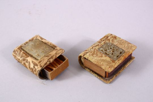 TWO CHINESE CARVED JADE INSET MATCH BOX HOLDERS, each inset with a small carved jade pendant, two figures and a swastika, and a phoenix, 6.5cm x 6cm (2)