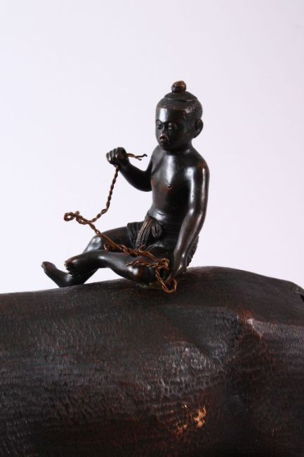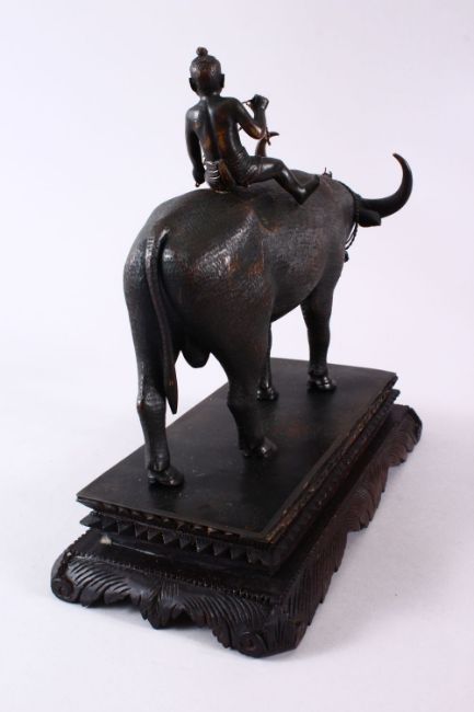 AN IDIAN JAIPUR SCHOOL BRONZE MODEL OF A COW, with a boy seated upon its back, mounted to a carved wooden base, 23cm high x 24cm wide.