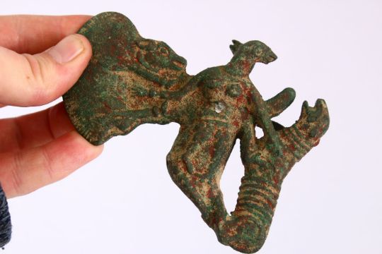 AN EARLY PERSIAN BRONZE ZOOMORPHIC AXE HEAD, together with bangle and dagger handle, axe 12cm high.