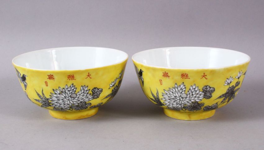 A PAIR OF CHINESE YELLOW GROUND PORCELAIN BOWLS, decorated with floral decoration and birds, the based with iron red seal marks, the front with red calligraphy, 10.5cm