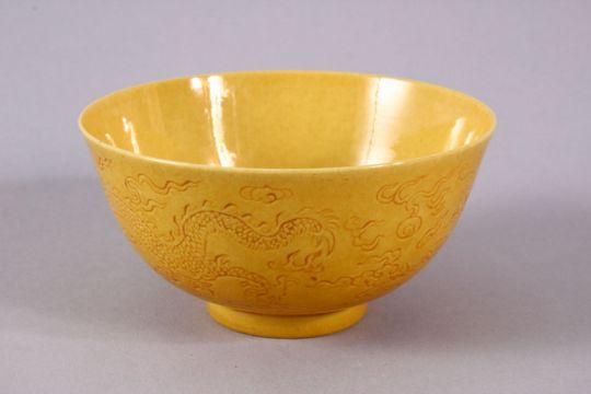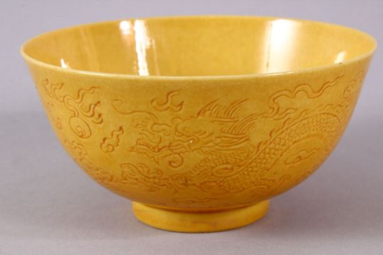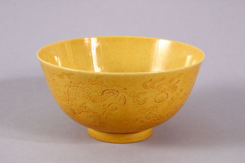 A CHINESE YELLOW GLAZED DRAGON PORCELAIN TEA BOWL - the body decorated with scenes of dragin chasing the pearl, the underside with a six character mark, 9cm