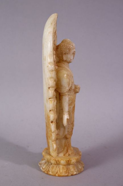 A 19TH / 20TH CENTURY CHINESE CARVED WHITE JADE / SOAPSTONE FIGURE OF A DEITY / BUDDHA, stood upon a lotus base, holding a vessel, 16cm,