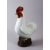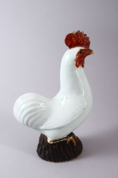 A CHINESE PORCELAIN FIGURE OF A COCKEREL, with carved feather decoration with a pale celadon glaze, seated upon stylized wooden stump, 24cm high.