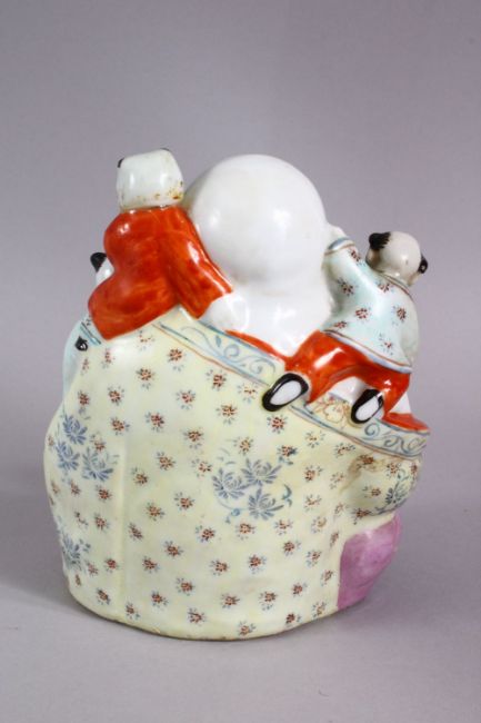 A CHINESE REPUBLIC STYLE FAMILLE ROSE PORCELAIN FIGURE OF BUDDHA, seated with boys, 17cm high