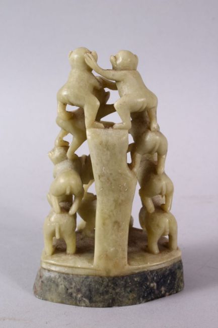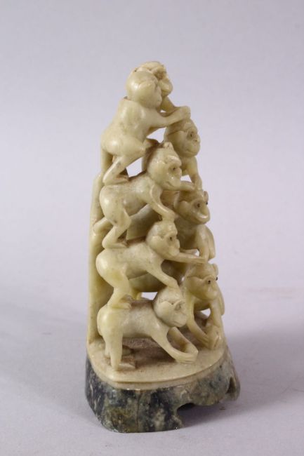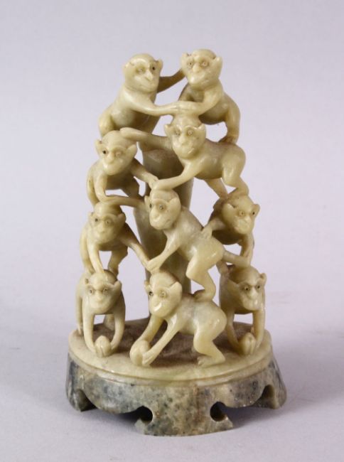 A CHINESE CARVED SOAPSTONE FIGURE OF MONKEYS, the carving depicting ten monkeys climbing, 11cm high.