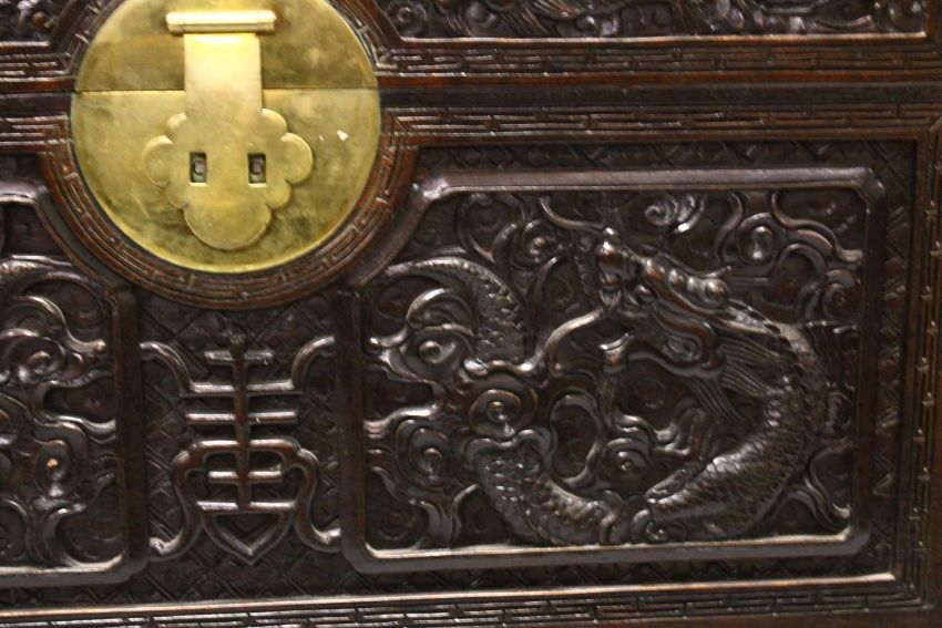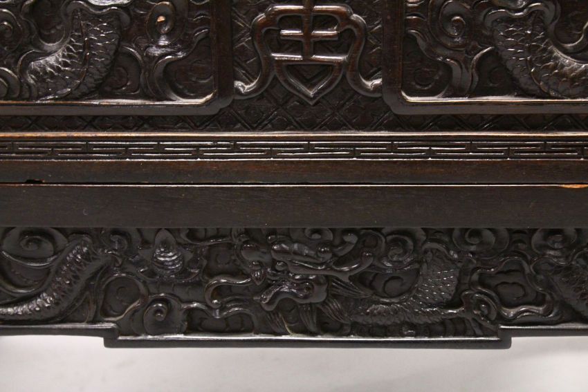 A GOOD 19TH CENTURY CHINESE CARVED HARDWOOD / HONGMU DRAGON CARVED LIDDED CHEST, the panels of the chest carved deeply to depict panels of dragons and bats, stood upon its similarly carved stand, 78cm high x 78cm wide x 48.5cm deep.