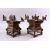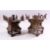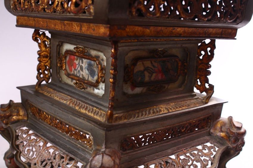 A MATCHED PAIR OF 19TH CENTURY CHINESE SPELTER PAGODA FORM CANDLE STANDS, with cast and pierced decoration, 24cm high, 20cm wide.