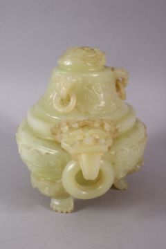 A CHINESE CARVED JADE TRIPD LIDDED CENSER, carved with lion dog handles and rings, stood upon three carved claw feet, the cover with a floral spray and miniature dog mask handle and rings, 14cm x 18cm.