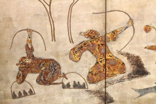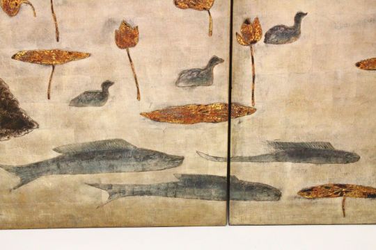 A SUPERB VIETNAMESE THREE PANEL PAINTING OF A HUNTING SCENE ATTRIBUTED TO NGUYEN VAN MINH, Wood and poly chrome, The large three piece panel depicting a hunting two archers waterside hunting geese, fish and lilies to the lower section, bottom right with seal mark ATTR to Nguyen Van Minh, overall approx 240cm wide x 120cm high.