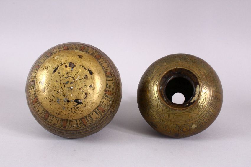 TWO 18TH CENTURY SOUTH INDIAN COPPER & BRASS MOULDED LOTA VASES, 11.5CM & 10.5CM.
